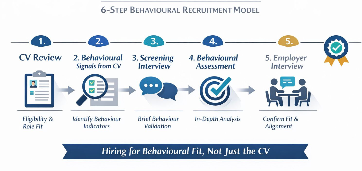 - Behaviour‑fit screening and structured interview questions.